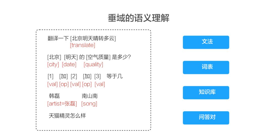 垂域理解就是每一个垂域用的算法、方法都是不一样的,譬如说北京明天天气怎么样?北京明天晴转多云。单说这句话其实是一个天气类的,但你直接前头加入一下“翻译”两个字,它就变成了一个翻译类的。