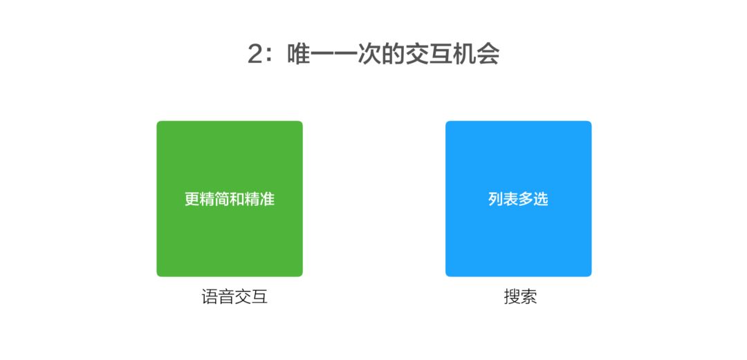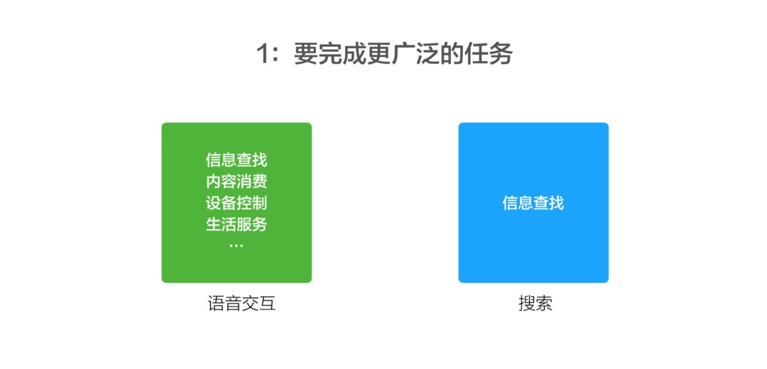 第一,语音交互其实是完成更广泛的任务。在手机上我要给家人打一个电话,或者上一个闹钟,它本身要去完成的除了信息查询以外,还有设备控制,有内容消费、生活服务。它本身被认为是帮助用户去完成特定任务,并且不出错。而在这种情况下,搜索还是相对比较单一的。