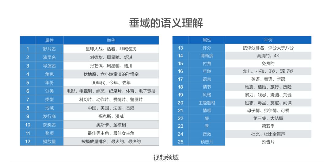 语义的垂域理解,这块还是挺复杂的,每一个垂域自己的知识库和领域都是很复杂的。要理解这种用户的复杂查询的话,一定要对后台的知识库,甚至是用户有深度的理解,所以针对视频这一块,非常简单列了一下,我们有 25 个相应的知识字段去构建知识库,只有这样的话,才能把用户复杂的查询构建好。