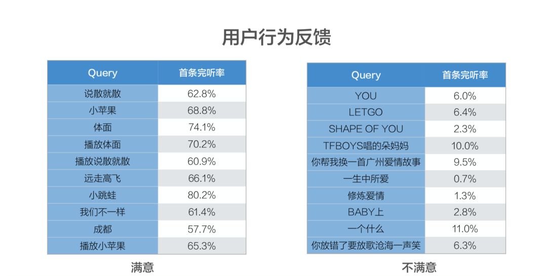 现在,我们在内容类的上面做了一点工作,就是通过首条完听率来判断它有没有把这首歌理解的对不对,我们也看到了一些数据,确实发现当我们判断出一些音乐意图,但是完听率又比较低的时候,这些 query 看起来就不像音乐了。