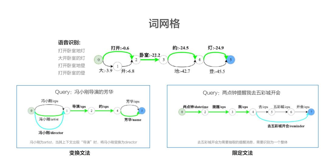 平时用户说打开卧室的灯,但是由于口音问题,或者是距离的问题,就是 AI 在识别的时候,它经常会“打开卧室地灯”,或者“大开卧室的灯”,识别出不同可能性出来。这是语音识别的结果给 NLP 的输入,基于这个输入,我们通过词网格的方式,去寻找一种最优路径,去构建出它最优的可能性。