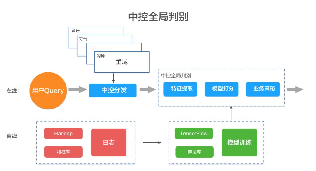我们就发现中控全局判别这件事越做越复杂。譬如,北京天气怎么样?翻译“北京天气怎么样”?对于天气而言的话,它就发现它前面多了两个词,它也不认识翻译,因为对于每一个垂域来讲,它都是局部的信息,很难去知道全局性的,它前面多了个翻译,自己的转换就不管了。