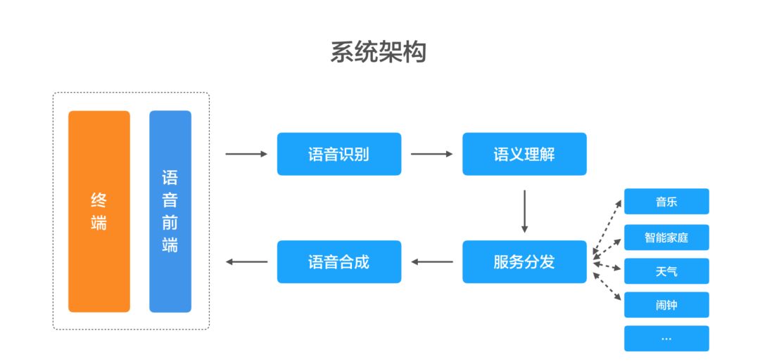 首先,就整个架构来说,在任何一个终端上,用户跟小爱同学说的话先是前端的一些信号数据,主要是声学技术,进去之后就是变成了一个纯用户的声音,通过语音识别转换成文字,然后通过语义理解,去了解用户真的想要什么,然后去服务的线上分发,最后进行语音合成,告诉用户希望什么样的结果。