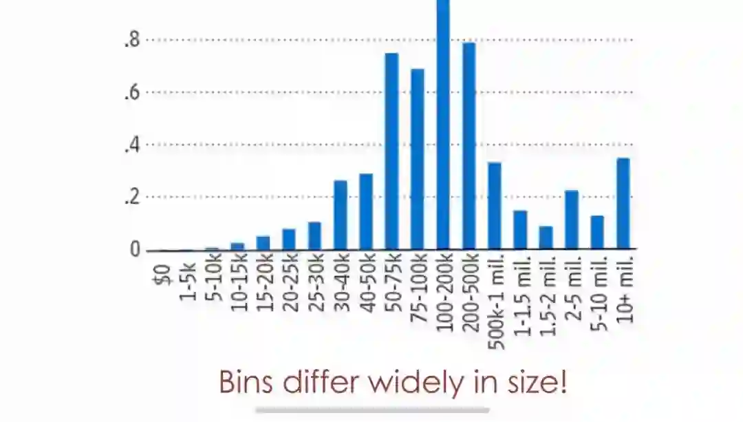 图表也可以操控每个箱子的尺寸大小来表达他想要的意思。比如下文是华尔街一篇臭名昭著的报道。这张图乍一看中间部分的 y 值最大。