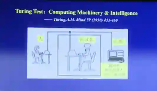 1950年,他写了一篇论文登在杂志上,题目是“计算可以思维吗?”我们说是计算的机理和智能,如果测试人看不到人和机器,在密闭的环境里,如果不能区分人和机器,大概就是智能的。2014年,一个聊天机器人尤金•古斯特曼投入了测试。