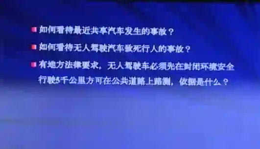 最近有一家公司的共享汽车发生了事故,全民关心。涉及到什么问题?出租车行业的职业道德、职业底线、职业操守的问题。最近又联系到无人驾驶车在全世界死人的问题,大家也很担心。交通部门发出很多的规定,特别是有的地方法规要求,无人驾驶车必须先在封闭环境里安全行驶五千公里才可以上路测试,如果你家里有一个车,跑五千里不算数就耗费掉了,还是挺心疼的。