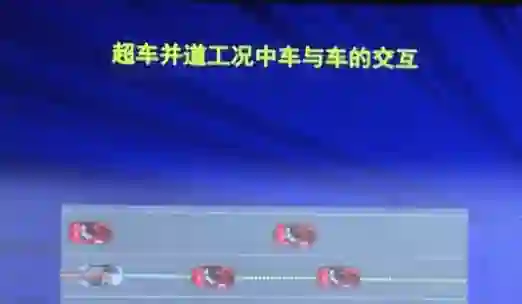 超车并道在无人驾驶中是一个难点,尤其当低速车道汇入高速车道比较难。我们做了一个例子,例如有四个红车是有人驾驶,一个灰色的车辆是无人驾驶,怎么换道?一定不时跟你周边几个车辆用打灯、按喇叭或者踩油门、刹车的方式告诉周边的人,如果他跟你协作,你超车并道了。