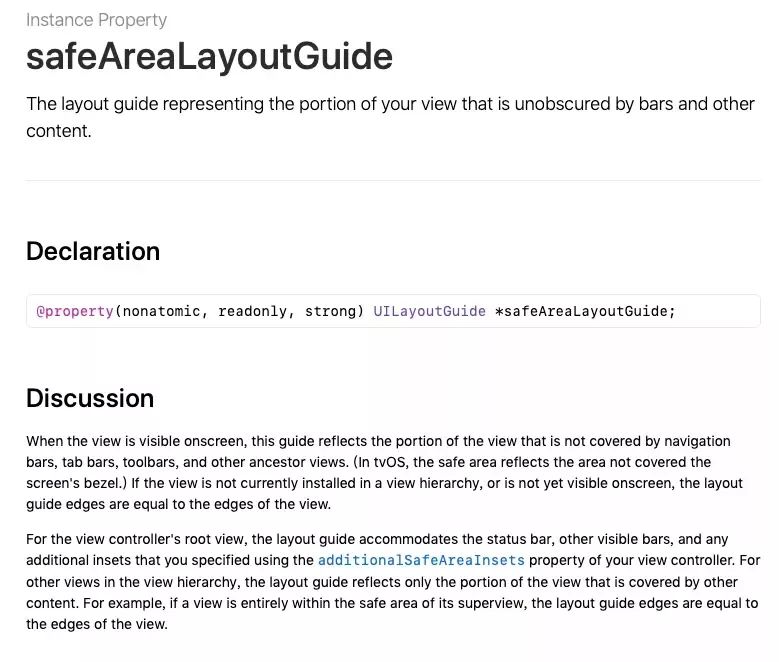 4.SafeAreaiOS7以后,苹果给UIViewController引入了topLayoutGuide 和 bottomLayoutGuide两个属性。用于表示顶部或底部的高度。根据有无显示状态栏、导航栏、tabBar返回高度。如果VC内嵌VC,内嵌的VC将视为另起的顶底坐标体系,不受原状态栏等影响。你可能听都没听过这两属性,因为开发中我们习惯直接用宏写上数值,几乎不用这两个属性。更何况那时iPhone还没有全面屏这种东西。