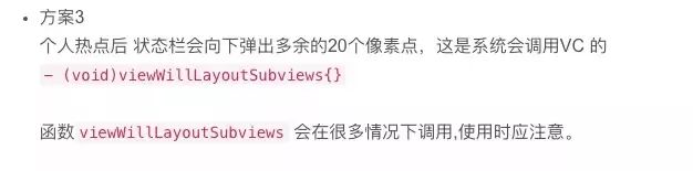 当状态栏增高时,App的控制器的view将会下移20,但是高度却不变。tabBar不会有任何改变。所以如果某个界面scrollView一直到底的话,最好用约束到底部,这样调用viewWillLayoutSubviews时就会修改scrollView高度。建议不要写高度,不然会出现scrollView底部显示丢失20高度的问题。