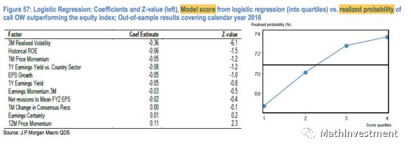 上图里面我其实有一个疑惑的地方,就是这个地方的score quantile(Model score from logistic regression)应该跟前面提到的10个factor的Q-score是不一样的。因为上面右图中随着这个score的增大,“call OW策略”优于单纯做多这个股票的概率越大,也表示着预测的股票的表现会随着这个score的增大而越来越差才对。