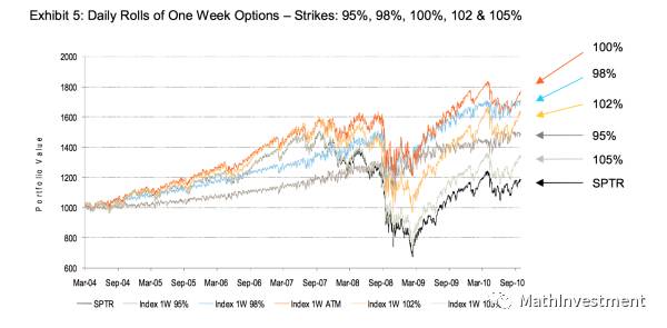 因为是sell option,所以可以一直收取premium拿到期。至于为什么是ATM的call,因为在at-the-money的时候,时间价值是最juicy的,也就是自己overwrite的时候可以收的premium会最大。如下图我们可以看到100% at-the-money的时候是最大化收益的。关注私募工场ID:simugongchang,加私募工场老板娘微信guo5_guoguo。除之此外,我们还可以看到一个有意思的现象,整体来说102%的收益比98%的低,105%的比95%的低,原因是volatility surface其中一个维度的volatility skew现象导致在相同程度的moneyness情况下,ITM会比OTM的implied volatility更大。