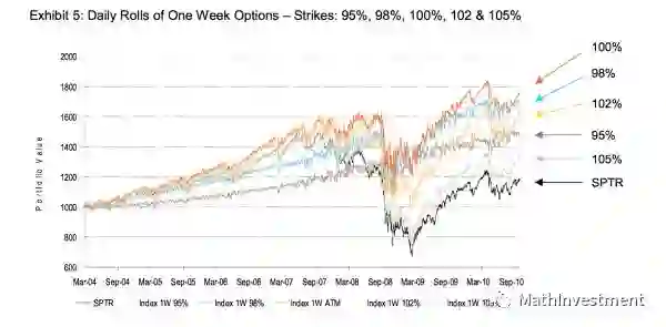 还有一个现象就是102%的比98%波动更大,105%的比95%波动更大,原因是ITM的已经包含了intrinsic value增加了缓冲区,但trade-off就是虽然ITM的会风险更小但是upside potential也会受到限制(我们可以看到102%和105%一开始其实是比98%和95%收益更高的,但当掉下去的时候也掉的更多,所以OTM的波动更大)。