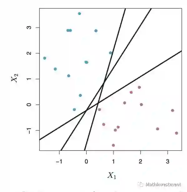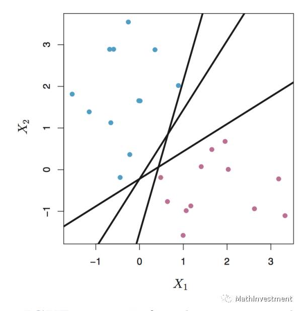 我们想要做的事情呢,就是用一条线把这些点区分开来(譬如图上的三条黑线都可以把蓝色的点和红色的点分开了)。由于这是二维平面上面的一条线,所以其表示的方程就是: