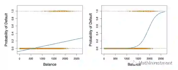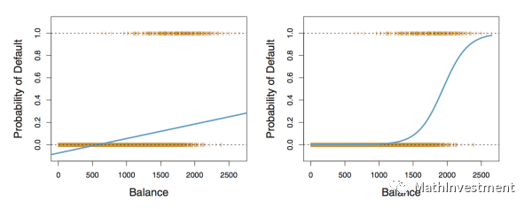另一个问题就是由于linear model是一条线,所以这条线对于横轴balance上的某些点,会使得纵轴probability of Default甚至有小于0和大于1的情况。我们这里讨论的是概率,只会属于0和1之间,所以小于0和大于1的预测在这里明显是不对的。