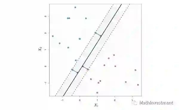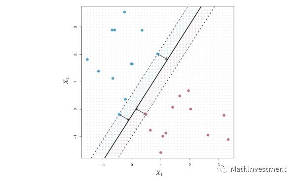 然后就变成了如下这张图,中间那条黑色的实线就是之前M=0的情况,而两条虚线就是方程加上某个正数M之后的效果((其实就是对中间这条黑线分别上下平移距离M)。关注私募工场ID:simugongchang,加私募工场老板娘微信guo5_guoguo。还需要注意的是,这里M并不是我们人为给的一个值,而是上面的数学式对所有的点经过一定的optimization之后得到的结果,各个Xi系数𝛃的值也是一样经过optimization之后的结果。