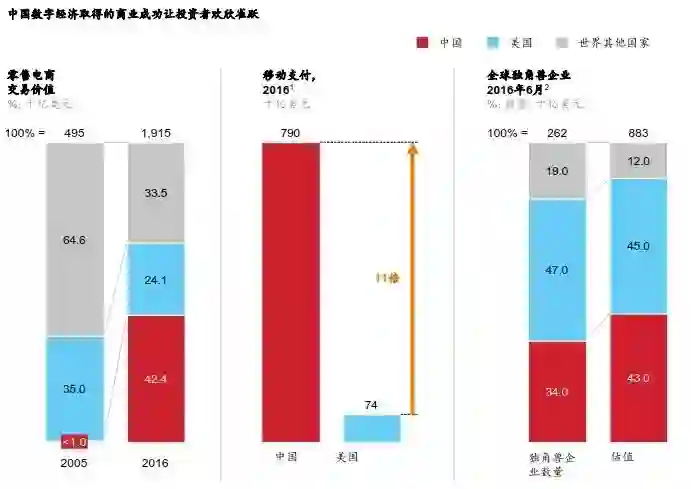 2017年8月麦肯锡(McKinsey & Company) 全球研究院(Global Research Institute)的调研指出中国数字经济取得很不错的成就; 2016零售电商交易价值占全球的42%, 移动支付金额是美国的11倍, 同时全球独角兽企业(Unicorn Enterprise: Market Value > US$1 Billion)的数量及总估值是全球第二。