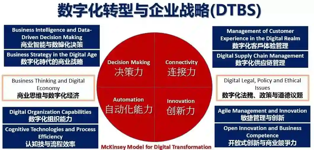 港大ICB数字化转型与企业战略(Digital Transformation & Business Strategy或DTBS) 的课程设计重点是以麦肯锡数字化转型框架(McKinsey Model for Digital Transformation [见附图]) 作知识结构基础, 透过结合学术及实践并重的教师团队[见官网]使学员有系統地全面认识和了解企业数字化转型中的四个重要领域(决策力、连接力、创新力和自动化能力)与数字化转型的最新知识及工具,辨认与业务发展战略相关的技术和市场趋势,分析业务现状,拟定企业战略及相关行动方案,并辨别在执行项目方案中促使成功的主要因素并作出恰当的管理。