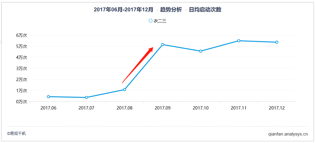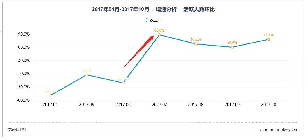 易观千帆数据显示,2017年6月至7月,衣二三活跃用户环比出现较大增长,其中7月环比增长88.0%,足见这次合作对衣二三用户的拉动作用。