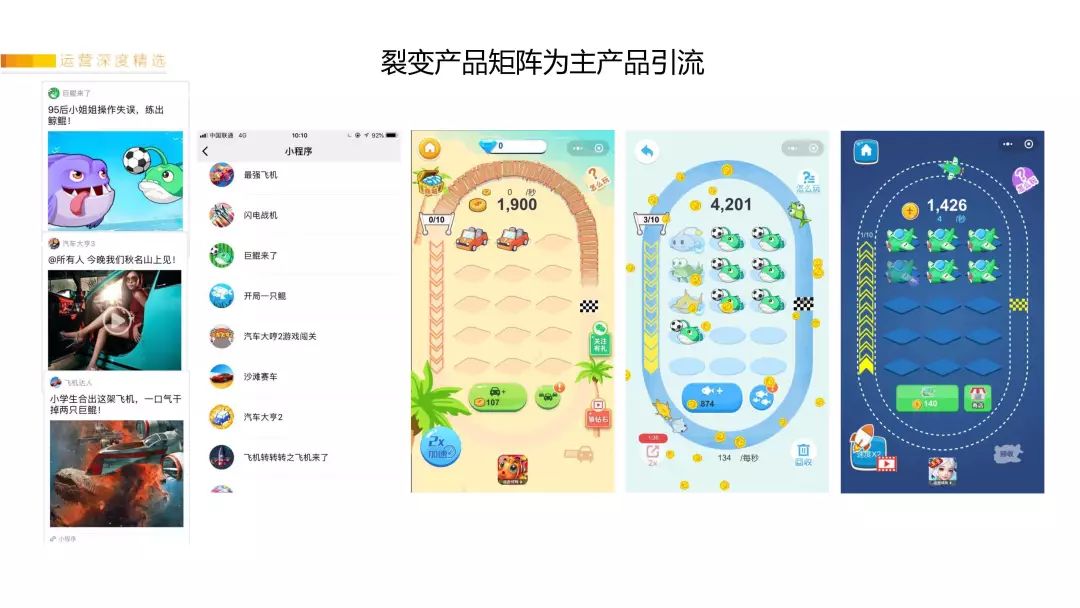 包括前阵子“巨鲲来了”的小游戏火了,0推广成本1周裂变了500万用户。很快陆陆续续就出了“汽车来了”、“飞机来了”、“猫来了”、“狗来了”、“猪来了”等复刻版小程序。这也是因为微信有10亿月活用户,只要你的起始渠道给力,总能圈到属于你的一批用户。
