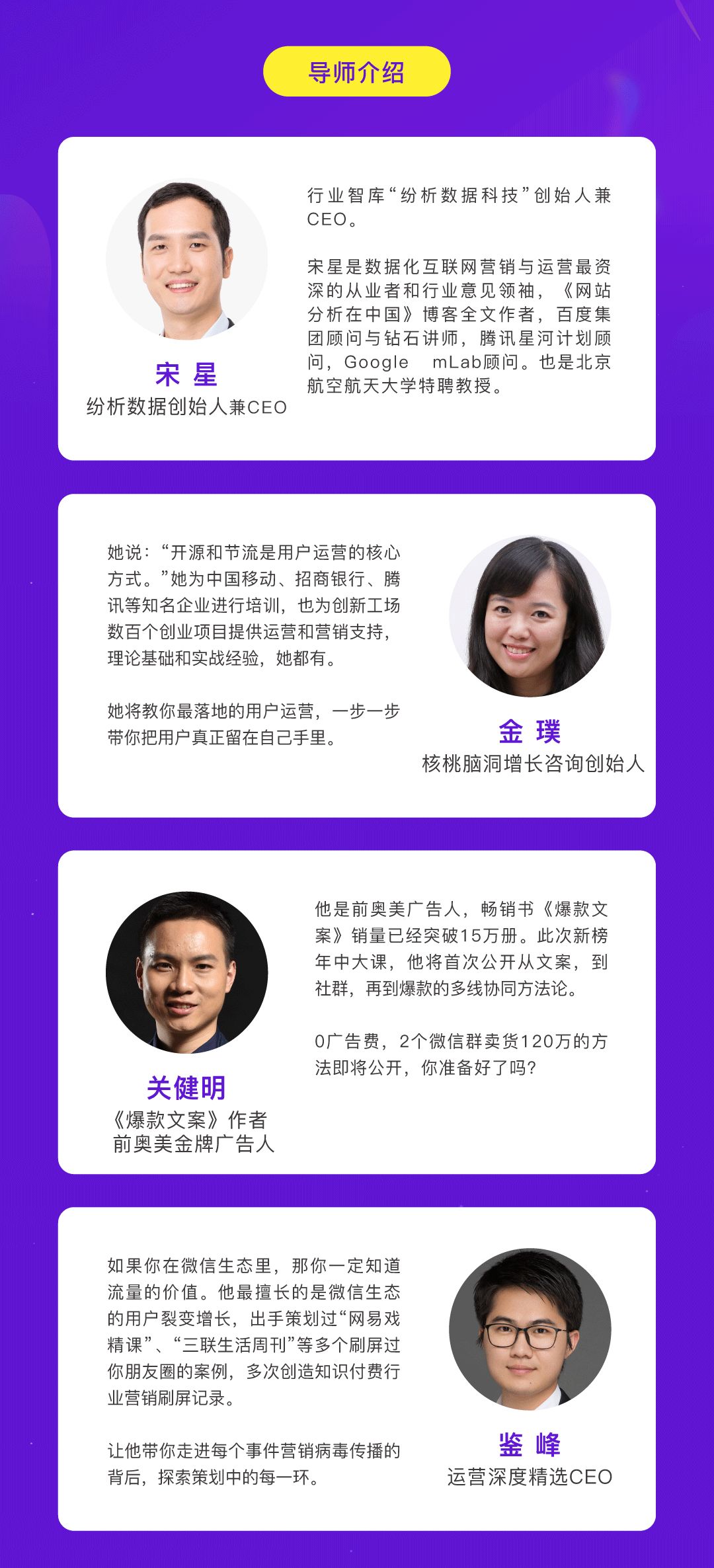 刚好,鉴锋也是我们年中大课的导师之一。他将与其他3位导师一起,围绕系统化运营、数据运营、刷屏、流量、文案等多个维度,奉上一堂运营知识的盛宴。