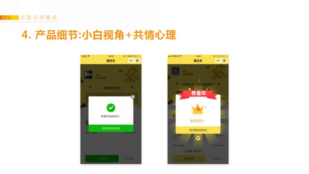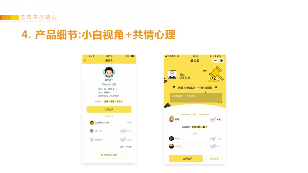 例如用户的第一名被抢走了,会有模板消息通知Ta。之前UI是把竞拍的1、2、3、4名排列放一起,但为了激发用户的竞争心理,所以第一名需要特殊对待、让他享受万众瞩目的感觉,失败的人则放在一起,冷淡加灰色蒙层处理。