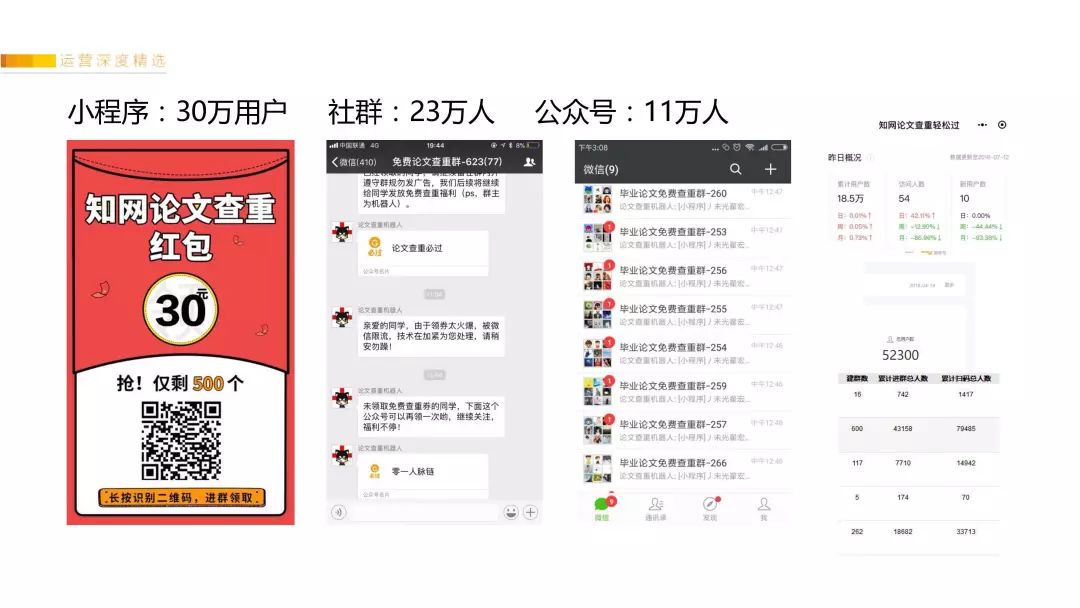 这样子循环裂变,通过这三个裂变玩法组合,2周时间裂变了,30万+小程序用户、23万+社群用户、11万+公众号用户、盈利70万。