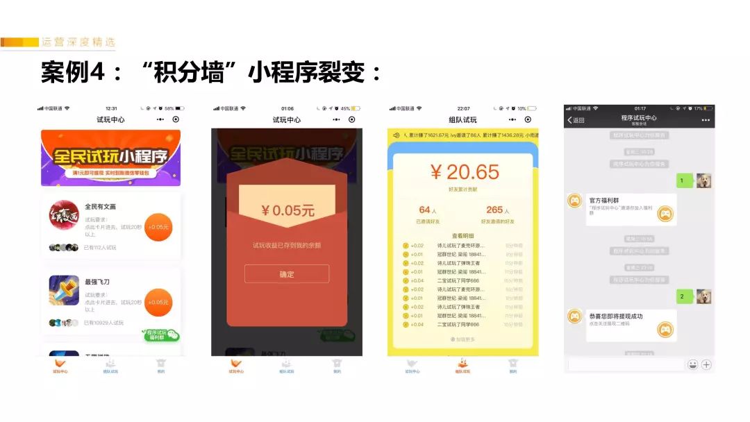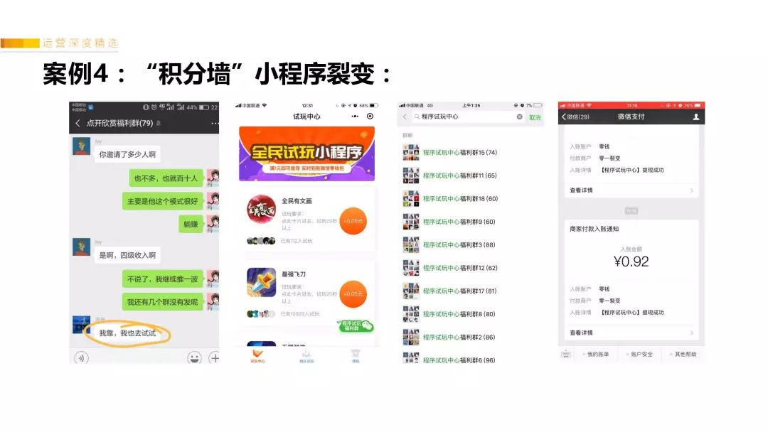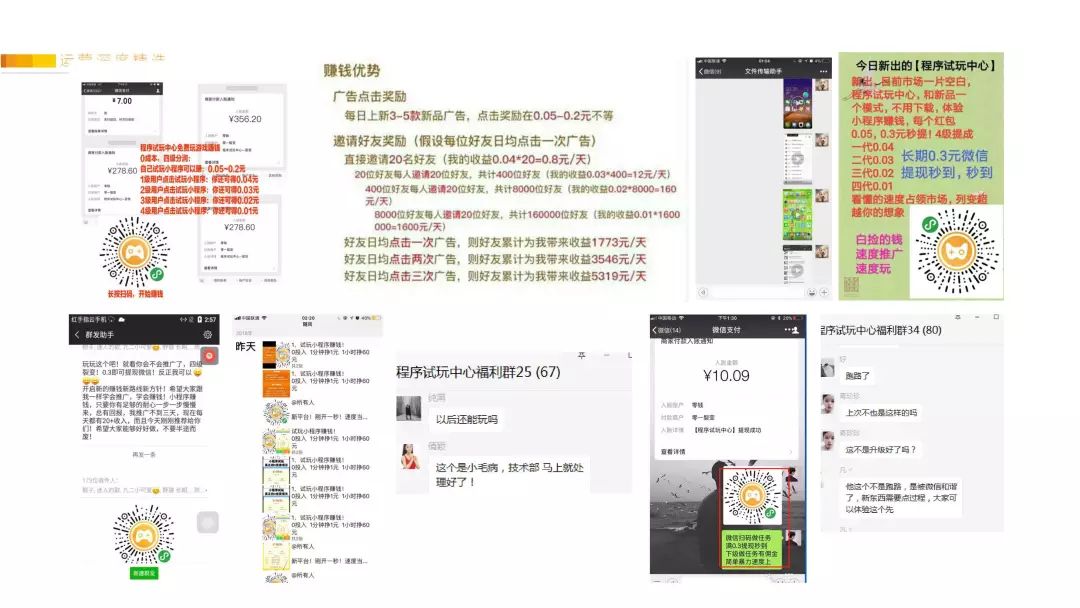 设计了进群的按钮引导、提现必须关注公众号(公众号里也引导用户进群)。在微信群里面通过小号调动氛围,以用户的名义在群里炫耀,发高额的“后台收益截图”、“微信到账截图”(特别是截图显示,1级只有几个用户,2级有几百个用户,激发用户贪婪懒惰的欲望)。“用户证言”让其他观望的用户对小程序快速建立信任,相信这个小程序可以赚这么多钱。