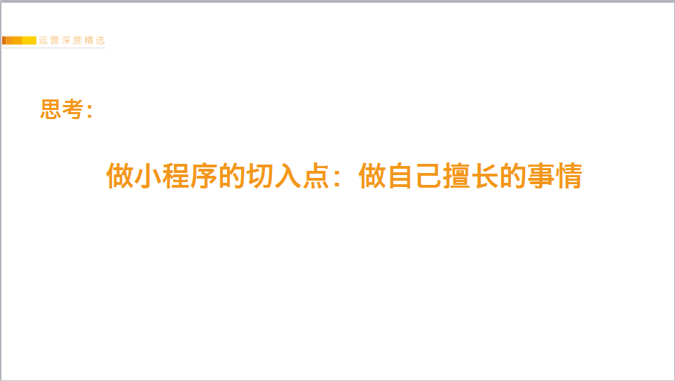 但最终想要走得长远,最好还是:做自己擅长的事情。在决定做小程序时,我一直在思考:做自己没有做过的事情,凭什么我能PK过别人?思考了1个多月,最终清楚了:我先把团队的核心能力:微信生态的“用户裂变”玩法提炼出来,先做怎么用“小程序裂变”传播,以这个为切入点,又回到了“自己擅长的领域”;这也是为什么能短短4个月,做的尝试还算相对顺利的原因。