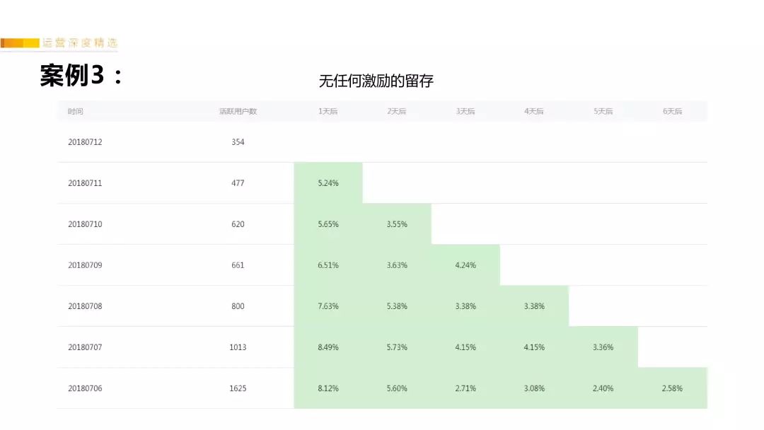 我们把“转发红包”停掉后,观察了“红包裂变来的用户”留存情况,在什么激励都没有情况下,发现两周后:正常的活跃用户只剩400~1000人,次日留存大概是5%-8%,7日留存只有2%。印证了:以利聚之、利尽则散。