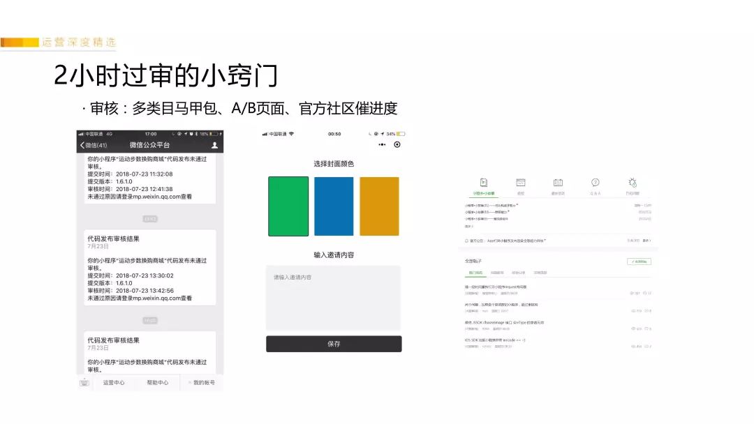 因为小程序的审核是外包出去的,每一家审核严格程度不一样。如果审核被拒,可以多尝试几个账号多试几次不同的类目,可以提高审核通过率(先查一下同行在什么类目,选择该类目的通过率比较高)。或1.0版本比较简单、1.1版本再迭代功能上线。很多人兴致冲冲得把小程序做得十全十美,结果发现审核过不了