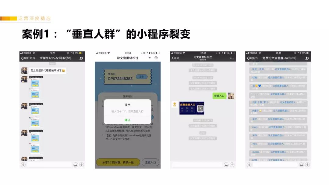 我们只在3个微商群里投放了小程序链接,就陆陆续续有用户进群。通过群运营后,用户非常活跃,还自己创作了非常多的推广话术、图片素材,如PPT里的素材,都是他们自己P图的,甚至有好几个用户手机录屏教大家怎么在微信上操作群发助手,给微信好友群发自己的二维码+话术,社群内自发互帮互助讨论推广技巧。