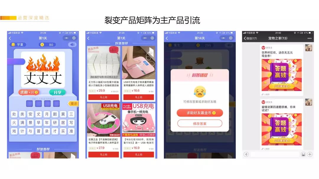 像拼多多,他会把这些“成语猜猜看”、“头脑王者答题类”火爆的裂变玩法,直接做成活动模板,放在他的首页引导用户去玩。