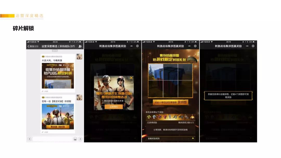 和“集字”的本质是一样的,不过“游戏化”的感觉更高,目前用户的新鲜感更强,比集字的裂变效率高,也是通过设置某个“碎片”的出现概率,可以一定程度上控制活动成本。