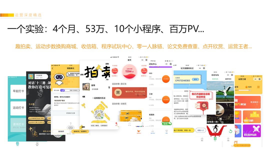 4月1日,我们开始试验小程序裂变的玩法,截止到今天,刚好4个月,陆陆续续一共尝试了10款不同方向的小程序:趣拍卖、运动步数换购商城、程序试玩中心、收信箱、零一人脉链、论文免费查重、点开欣赏、群里打卡、芒种特训营Pro、运营王者...