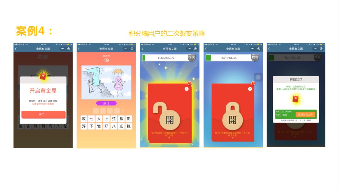 “猜成语”、“猜歌”的产品模型是五六线用户非常喜欢玩的,它能够让用户炫耀自己是有文化,有智商的一个产品,用户平时在生活中很少能有这种场景。