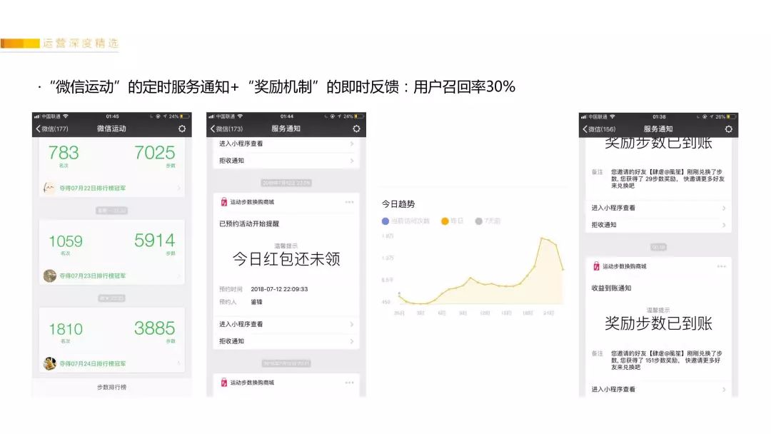 其次模仿“微信运动”每晚会在22点左右给用户推送“服务通知”,老用户召回率达30%。同时用户的下级签到了,也会推“服务通知”告诉用户收益到账,继续去喊未签到用户签到。
