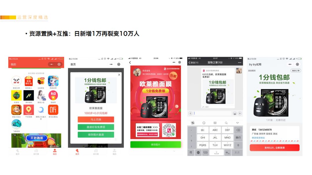 把产品的留存率、转发率打磨到最好之后,开始推广。通过资源置换找到7家10万日活的小程序,互相放广告位倒流,每一家可以给我们倒流5000~10000人,期间刚好得知寺库trytry在筹备周年庆的推广,准备了100万份“欧莱雅面膜1分钱包邮”(他只需要用户跳转到他的小程序页面填写地址下单)。于是我们把资源置换,引流来的流量引导领面膜裂变。持续做了6天,每天新增10~20万用户、产生5~12万笔订单。