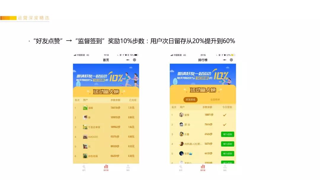 另外在运营过程中发现,这些用户都是扎堆抱团的,每个人都会有几个微信群。所以设计了“好友排行榜”模块,邀请好友每天签到,可以获得Ta“每日运动步数”的10%,通过这种给用户返利的形式,让她监督她的下级。这个功能把用户的活跃留存从20%最高单日提升到了60%。