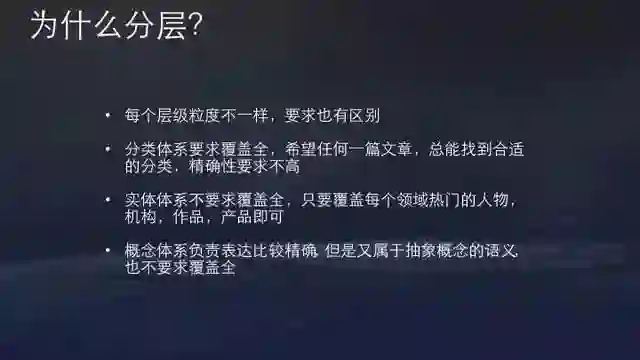 分类的目标是覆盖全面,希望每篇内容每段视频都有分类;而实体体系要求精准,相同名字或内容要能明确区分究竟指代哪一个人或物,但不用覆盖很全。概念体系则负责解决比较精确又属于抽象概念的语义。这是我们最初的分类,实践中发现分类和概念在技术上能互用,后来统一用了一套技术架构。