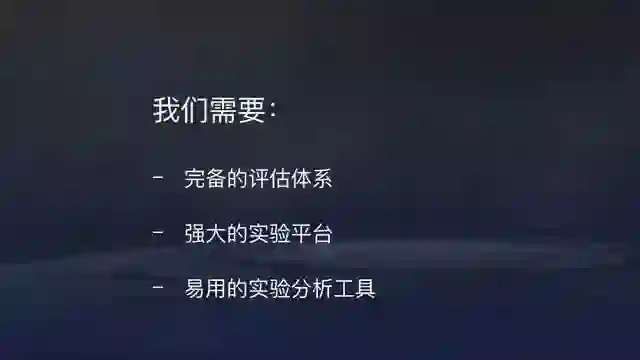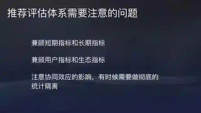 全面的评估推荐系统,需要完备的评估体系、强大的实验平台以及易用的经验分析工具。所谓完备的体系就是并非单一指标衡量,不能只看点击率或者停留时长等,需要综合评估。过去几年我们一直在尝试,能不能综合尽可能多的指标合成唯一的评估指标,但仍在探索中。目前,我们上线还是要由各业务比较资深的同学组成评审委员会深入讨论后决定。