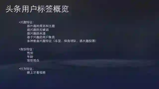 今日头条常用的用户标签包括用户感兴趣的类别和主题、关键词、来源、基于兴趣的用户聚类以及各种垂直兴趣特征(车型,体育球队,股票等)。还有性别、年龄、地点等信息。性别信息通过用户第三方社交账号登录得到。年龄信息通常由模型预测,通过机型、阅读时间分布等预估。常驻地点来自用户授权访问位置信息,在位置信息的基础上通过传统聚类的方法拿到常驻点。常驻点结合其他信息,可以推测用户的工作地点、出差地点、旅游地点。这些用户标签非常有助于推荐。