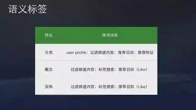 上图是头条语义标签的特征和使用场景。他们之间层级不同,要求不同。