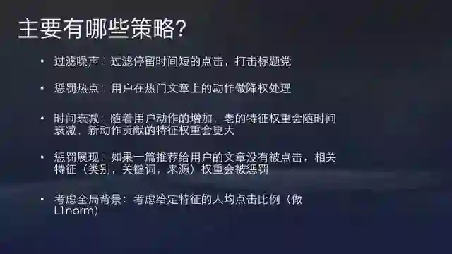 四、惩罚展现。如果一篇推荐给用户的文章没有被点击,相关特征(类别,关键词,来源)权重会被惩罚。当然同时,也要考虑全局背景,是不是相关内容推送比较多,以及相关的关闭和dislike信号等。