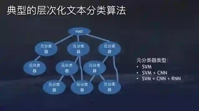 今日头条推荐系统的线上分类采用典型的层次化文本分类算法。最上面Root,下面第一层的分类是像科技、体育、财经、娱乐,体育这样的大类,再下面细分足球、篮球、乒乓球、网球、田径、游泳...,足球再细分国际足球、中国足球,中国足球又细分中甲、中超、国家队...,相比单独的分类器,利用层次化文本分类算法能更好地解决数据倾斜的问题。有一些例外是,如果要提高召回,可以看到我们连接了一些飞线。这套架构通用,但根据不同的问题难度,每个元分类器可以异构,像有些分类SVM效果很好,有些要结合CNN,有些要结合RNN再处理一下。