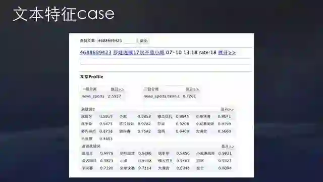 上图是今日头条的一个实际文本case。可以看到,这篇文章有分类、关键词、topic、实体词等文本特征。当然不是没有文本特征,推荐系统就不能工作,推荐系统最早期应用在Amazon,甚至沃尔玛时代就有,包括Netfilx做视频推荐也没有文本特征直接协同过滤推荐。但对资讯类产品而言,大部分是消费当天内容,没有文本特征新内容冷启动非常困难,协同类特征无法解决文章冷启动问题。