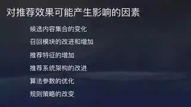 事实上,很多因素都会影响推荐效果。比如侯选集合变化,召回模块的改进或增加,推荐特征的增加,模型架构的改进在,算法参数的优化等等,不一一举例。评估的意义就在于,很多优化最终可能是负向效果,并不是优化上线后效果就会改进。