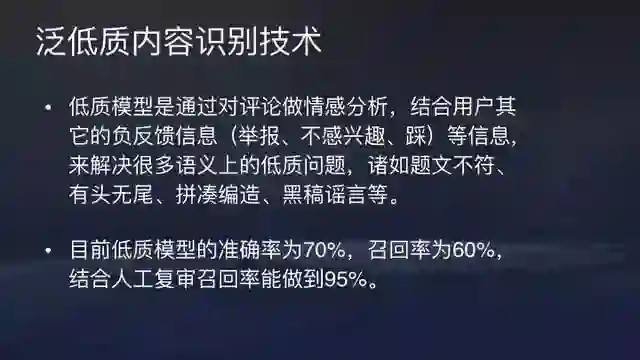 泛低质识别涉及的情况非常多,像假新闻、黑稿、题文不符、标题党、内容质量低等等,这部分内容由机器理解是非常难的,需要大量反馈信息,包括其他样本信息比对。目前低质模型的准确率和召回率都不是特别高,还需要结合人工复审,将阈值提高。目前最终的召回已达到95%,这部分其实还有非常多的工作可以做。头条人工智能实验室李航老师目前也在和密歇根大学共建科研项目,设立谣言识别平台。
