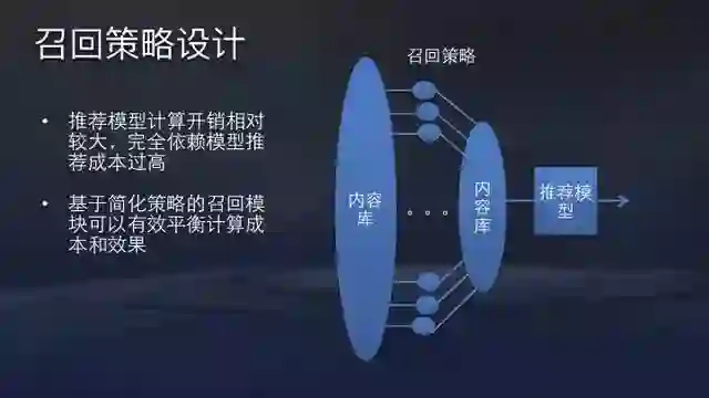 但因为头条目前的内容量非常大,加上小视频内容有千万级别,推荐系统不可能所有内容全部由模型预估。所以需要设计一些召回策略,每次推荐时从海量内容中筛选出千级别的内容库。召回策略最重要的要求是性能要极致,一般超时不能超过50毫秒。