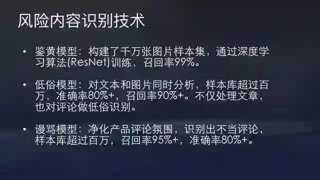 分享内容识别技术主要鉴黄模型,谩骂模型以及低俗模型。今日头条的低俗模型通过深度学习算法训练,样本库非常大,图片、文本同时分析。这部分模型更注重召回率,准确率甚至可以牺牲一些。谩骂模型的样本库同样超过百万,召回率高达95%+,准确率80%+。如果用户经常出言不讳或者不当的评论,我们有一些惩罚机制。