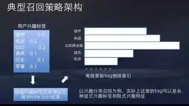 召回策略种类有很多,我们主要用的是倒排的思路。离线维护一个倒排,这个倒排的key可以是分类,topic,实体,来源等,排序考虑热度、新鲜度、动作等。线上召回可以迅速从倒排中根据用户兴趣标签对内容做截断,高效的从很大的内容库中筛选比较靠谱的一小部分内容。